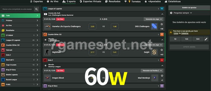 A aposta 60w oferece aos jogadores a experiência mais conveniente de apostas em eSports!
